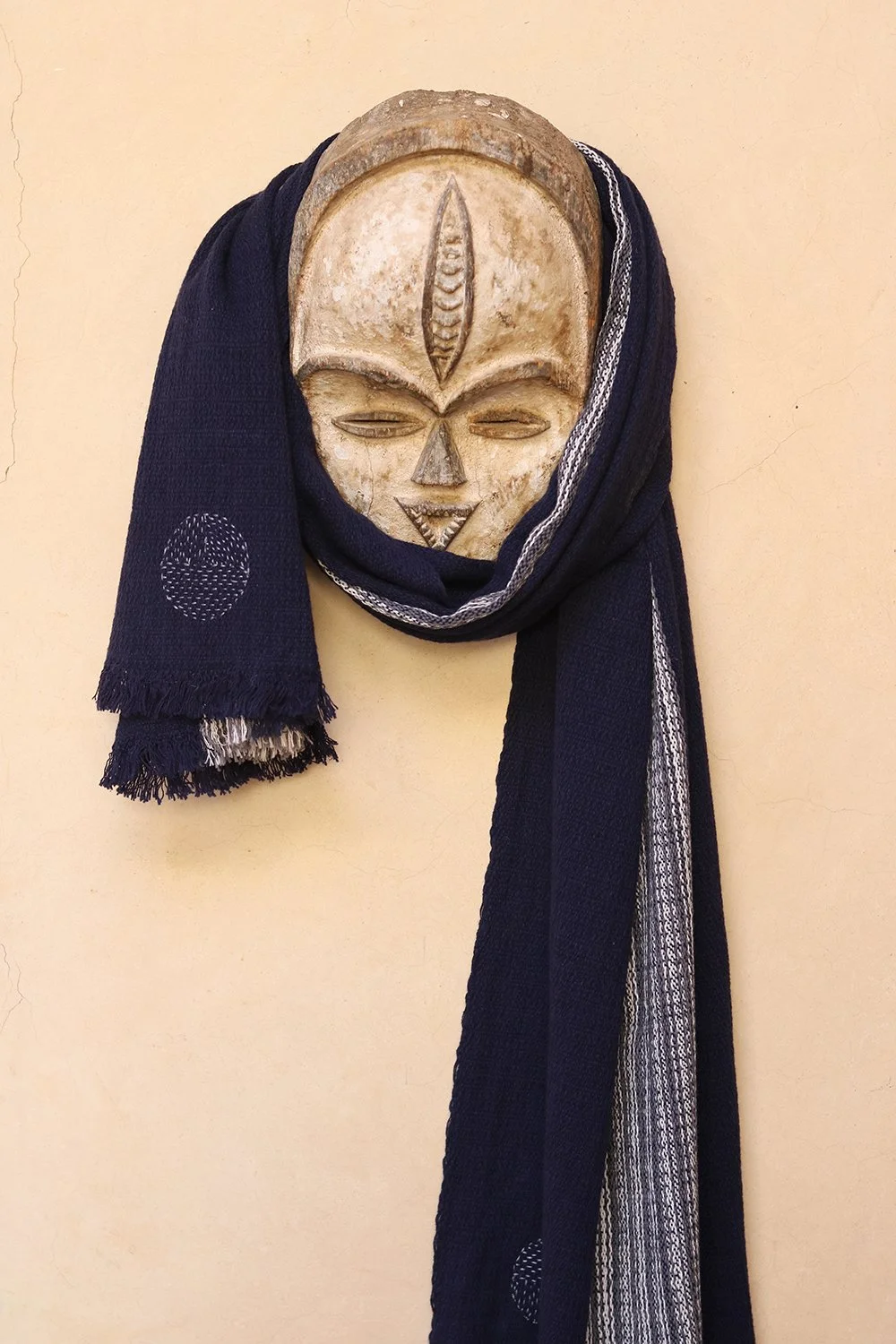 New hand-loomed Mancala Tissage cashmere and cotton scarf to keep you warm all through fall and winter. Adorned with a tone in tone hand embroidered Sashiko round motif.