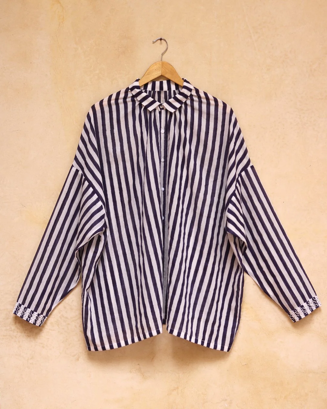 This one-sized comfortable blouse “Yasmine” is made from a superlight cotton block printed by hand. The block print’s slight irregularities make this fabric especially charming